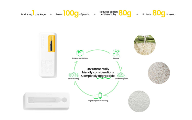 Wir glauben, dass echter Umweltschutz nicht nur bedeutet, weniger, sondern intelligenter zu verbrauchen. Unsere Soocas NEOS II-Verpackung wird aus Zuckerrohrbagasse hergestellt, einer nachhaltigen und baumfreien Alternative, die unseren ökologischen Fußabdruck deutlich reduziert.